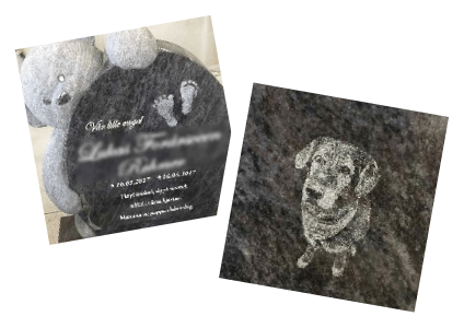 Notera att lasergravyr framstår bäst på mörka stentyper, men även på dessa kommer de att framstå svagare än en porslinsbild.