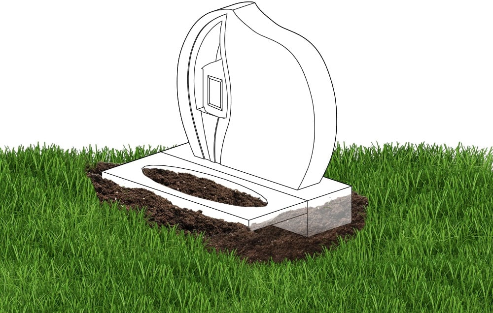 Denne illustrasjonen viser hvordan bedplaten ligger plassert foran gravsteinen. Bedplaten har som standard 5cm høyde og monteres slik at den flukter med sokkelen og terrenget rundt.