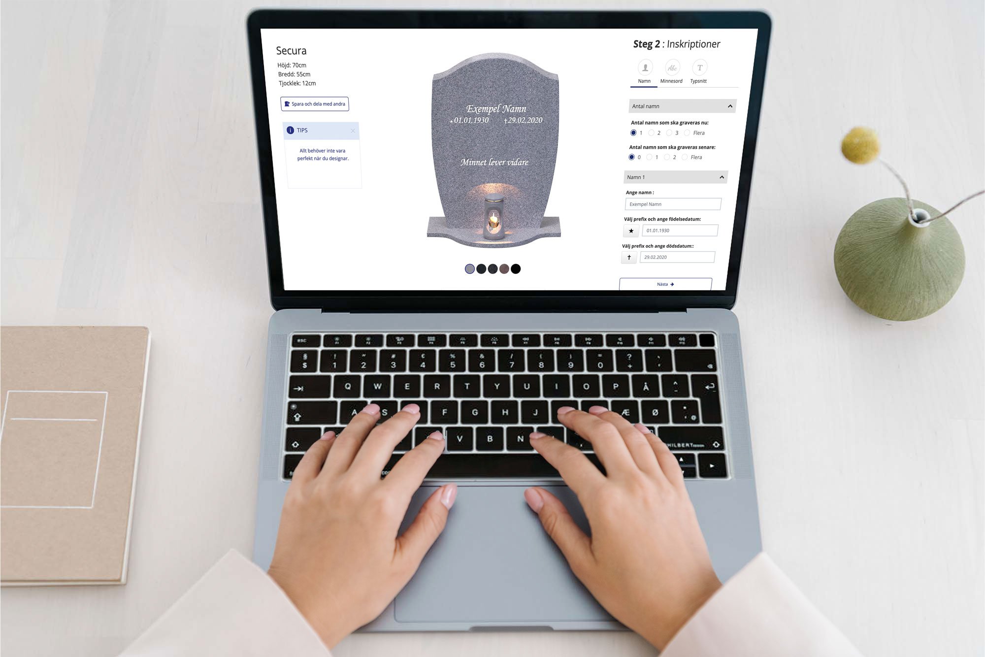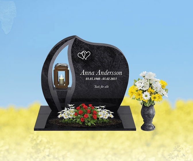Modern teknik har använts för att simulera hur gravstenen kommer att se ut när den är färdig graverad. Vi på Gravsten Sverige har utvecklat ett verktyg som ger dig möjlighet att själv se vilka kombinationer av gravstensmodeller, stentyper och gravyrer som passar bäst. Vi kallar det här verktyget Designa Gravsten och det är tillgängligt för alla våra gravstenar.